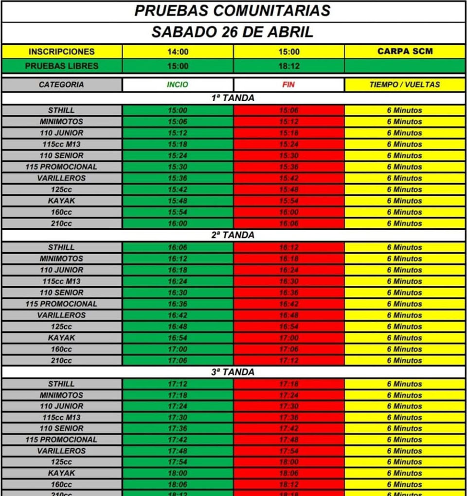 El acceso al predio estará habilitado desde las 12:30, mientras que las inscripciones se tomarán entre las 14:00 y las 15:00 bajo la carpa SCM. La actividad en pista comenzará a las 15:00 y se extenderá hasta las 18:15, con tres tandas de seis minutos por categoría.