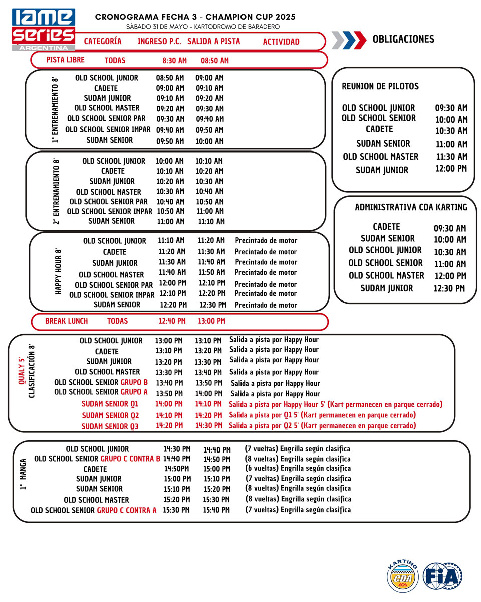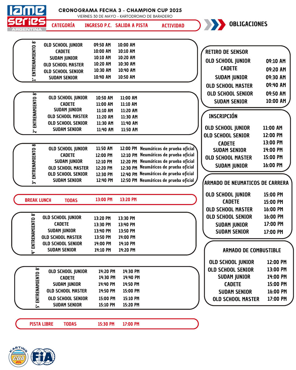 La actividad comenzará el viernes con cinco entrenamientos de ocho minutos por categoría, junto a las tareas administrativas, precintos de motores, armado de neumáticos de carrera y armado de combustible. Habrá además un cierre de jornada con pista libre para todas las divisionales.