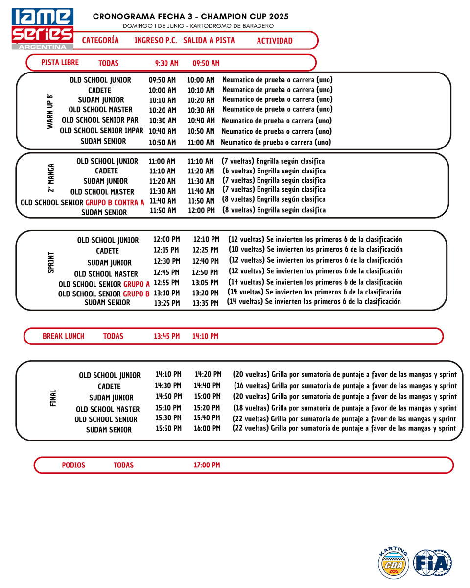 En tanto, la Old School Senior también tendrá una estructura particular. Su clasificación se realizará en dos grupos (A y B), mientras que las mangas se correrán en formato de grupos combinados: A vs. B, A vs. C y B vs. C. El domingo se disputarán dos Sprint (Grupo A y Grupo B) y solo los 36 mejores accederán a la final.
