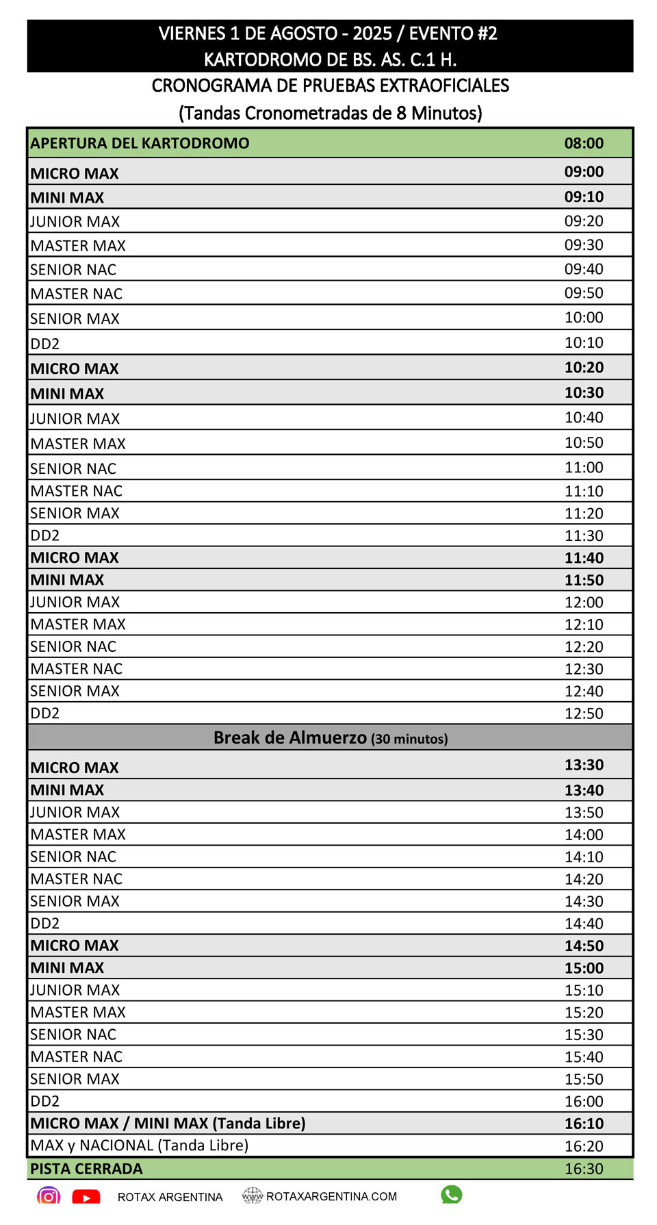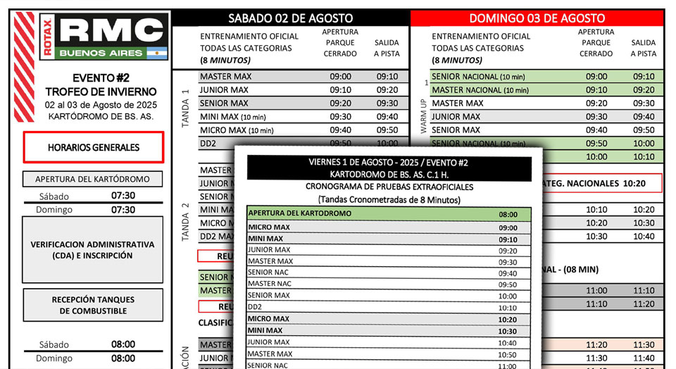 La actividad oficial se desarrollará entre el sábado y domingo, pero el viernes se llevarán a cabo pruebas extraoficiales, con tandas cronometradas de ocho minutos para todas las categorías. Las prácticas comenzarán a las 9:00 con la Micro Max y finalizarán a las 16:30, con dos tandas libres divididas entre Micro/Mini Max y Max/Nacional.