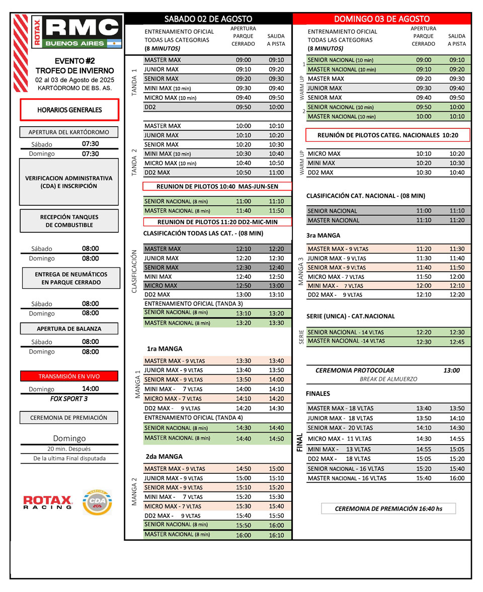 El sábado 2 de agosto arrancará a las 8:00 con las verificaciones administrativas y entrega de neumáticos. Luego vendrán los entrenamientos oficiales, la clasificación para todas las categorías y las dos primeras mangas para las divisionales Max y la DD2. Las Nacionales tendrán actividad recién a partir de las 11:00, con tandas de entrenamientos.